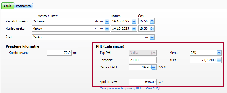 - v časti PHL (zahraničie) doplňte informácie tankovaní – Čerpanie v litroch, Cenu s DPH za liter, Menu a Kurz,