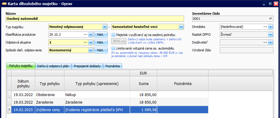 - O vypočítanú sumu DPH, ktorú vrátite daňovému úradu navýšite aj obstarávaciu cenu majetku, na záložke Pohyby majetku tlačidlom Pridaj pohyb,