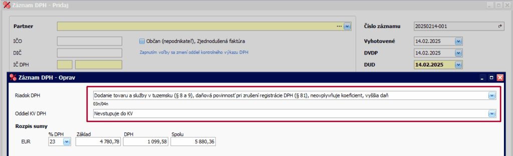 - v ďalšom formulári vyberte riadok 03n/04n (Dodanie tovaru a služby v tuzemsku (§ 8 a 9), daňová povinnosť pri zrušení registrácie DPH (§ 81), neovplyvňuje koeficient, vyššia daň) a oddiel KV vyberte Nevstupuje do KV.