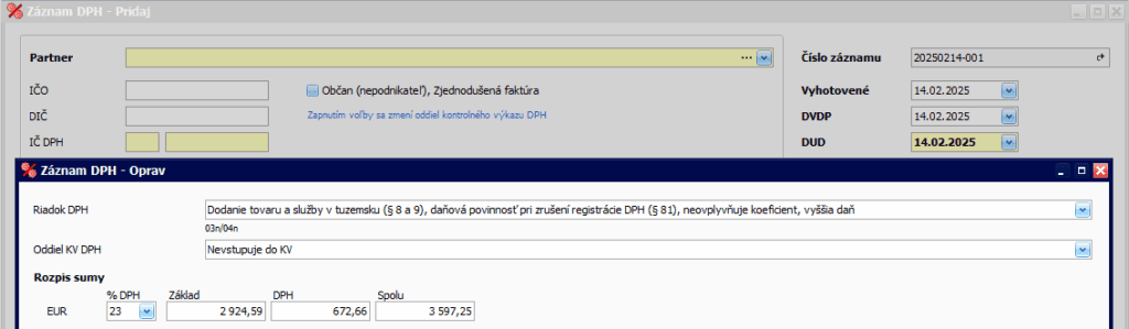 - Sumu zaúčtujte priamo v evidencii DPH tlačidlom Pridaj, kde vyplňte dátumy, prípadne partnera,