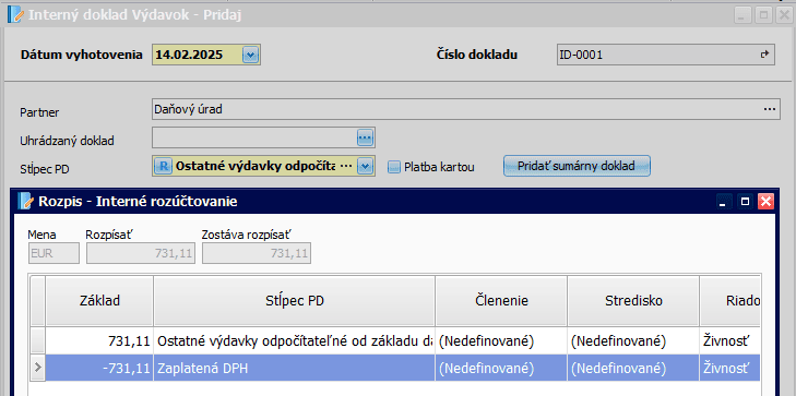 - vypočítaná suma DPH zo zásob a z majetku, ktorého obstarávacia cena je nižšia, ako 1 700 eur má vstupovať do daňových výdavkov. Z toho dôvodu sumu 731,11 eur preúčtujte cez Interný doklad do stĺpca Ostatné výdavky ovplyvňujúce základ dane.