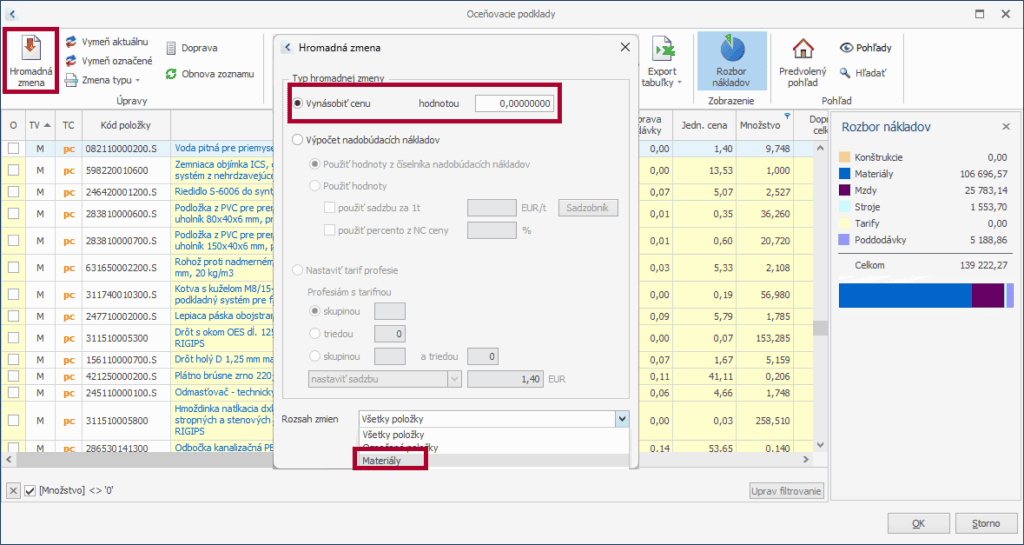 V okne oceňovacích podkladov zvoľte možnosť Hromadnej zmeny. Na to, aby ste dosiahli cenu iba za prácu bez materiálu je potrebné vynásobiť cenu všetkých materiálových položiek hodnotou “0”
