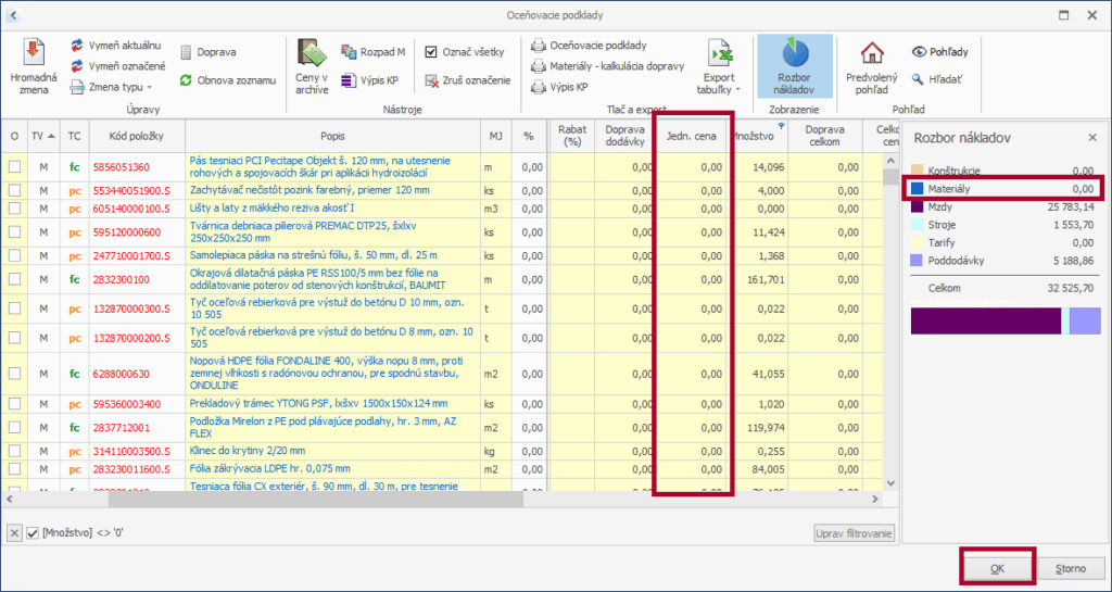 Touto zmenou dosiahnete, že jednotková cena všetkých materiálov bude vynulovaná a zostanú ocenené iba položky za cenu pracovníkov, strojov a subdodávok. Zmeny sa prenesú až potvrdením tlačidla OK.