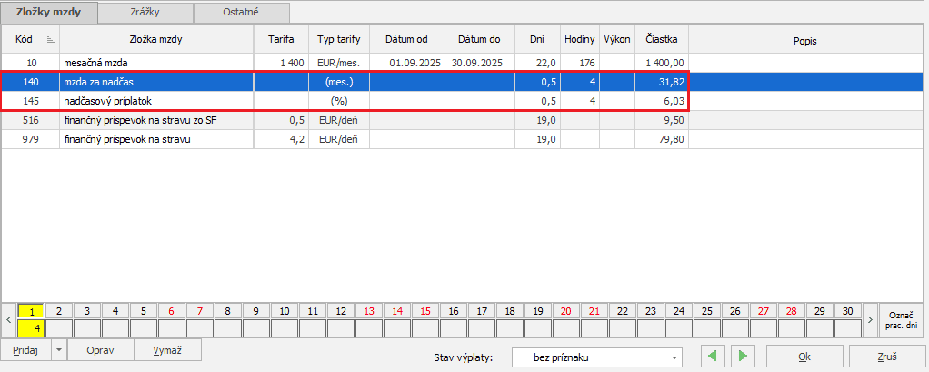 Zamestnanec pracuje obvykle od PO – PIA a je odmeňovaný mesačnou mzdou. Za mesiac 09/2025 odpracoval všetky zmeny a v pondelok 01. 09. 2025 odpracoval 4 hodiny nad rámec svojho bežného fondu. Ako bude vyzerať jeho mzda a na aké príplatky má nárok v mzde za 09/2025?