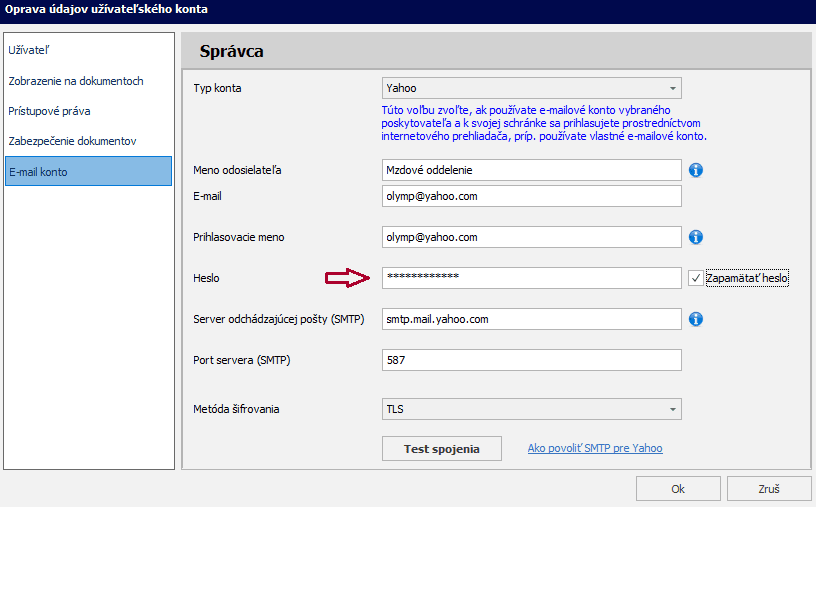 4. Zobrazené heslo zadajte bez medzier (skopírujte) do poľa Heslo v Olympe na záložke Nastavenia – Užívatelia – E-mail konto a kliknite na tlačidlo “Test spojenia”.