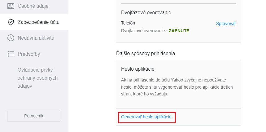 - Otvorte stránku https://login.yahoo.com/myaccount/security a v sekcii Prístup k účtu je potrebné vygenerovať Heslo aplikácie.
