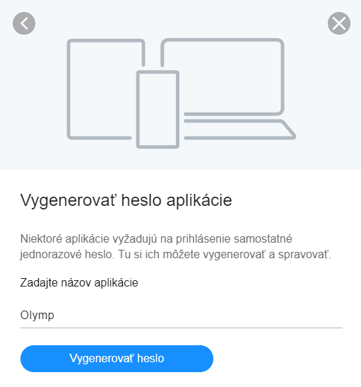 2. Zadajte názov aplikácie “Olymp” a kliknite na tlačidlo “Vygenerovať heslo”.