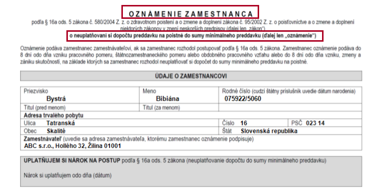 Ak má zamestnanec v kalendárnom mesiaci súčasne viacerých zamestnávateľov, je SZČO, prípadnepoistencom štátu a zamestnávateľ doposiaľ nemá informáciu o tejto skutočnosti, môže sa rozhodnúť, že navýšenie odvádzaného preddavku na sumu minimálneho preddavku si neuplatní.
