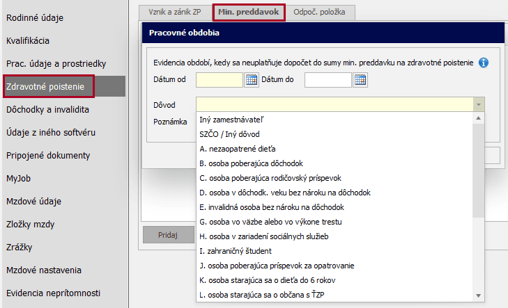 Obdobia, počas ktorých je zamestnanec v ZP prihlásený, ale nemá sa za ne uplatňovať dopočet do minimálneho preddavku na ZP, zaevidujete v Personalistike na karte Zdravotné poistenie na záložke Min. preddavok.