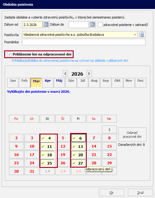 V Personalistike na karte Zdravotné poistenie na záložke Vznik a zánik ZP označíte voľbu Prihlásenie len na odpracované dni a v kalendári označíte dni, ktoré dohodár odpracoval.