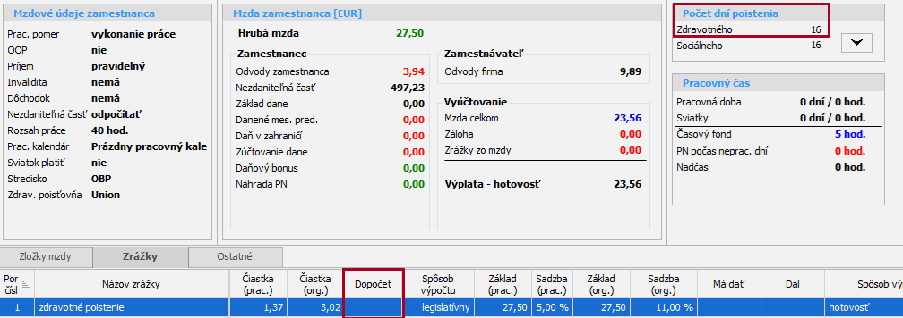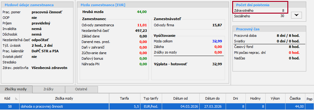 Počet dní zdravotného poistenia skontrolujete vo vygenerovanej výplate v pravom hornom rohu.