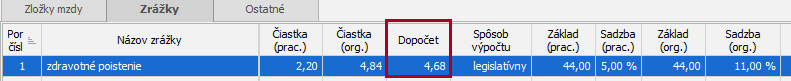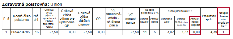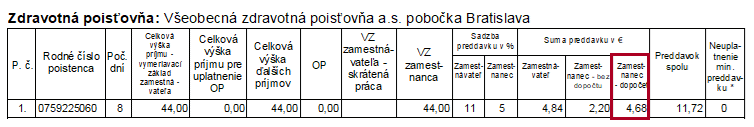 Dopočet do min. preddavku = 11,72 eura – 7,04 eura = 4,68 eura Preddavok na poistné zamestnanca je celkovo vo výške 6,88 eura (2,20 eura + 4,68 eura) a zamestnávateľa za zamestnanca je vo výške 4,84 eura.