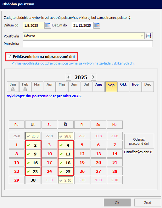 V septembri 2025 zamestnanec pracoval 8 dní, to znamená, že počet dní zdravotného poistenia je 8.
