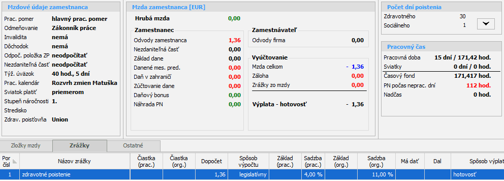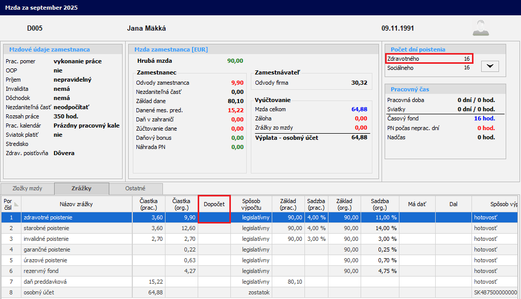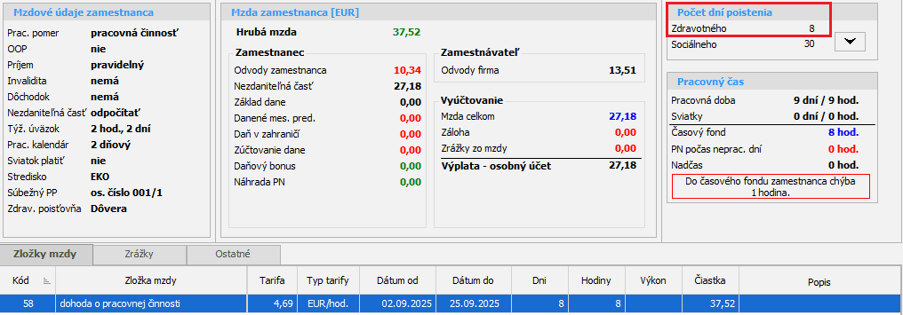 Počet dní zdravotného poistenia skontrolujete vo vygenerovanej výplate v pravom hornom rohu.