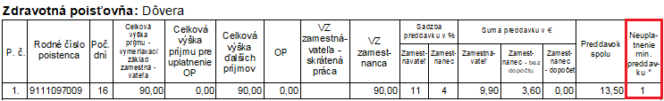Ak si zamestnanec na celé obdobie zdravotného poistenia v danom mesiaci uplatnil výnimku z dopočtu, tak sa v mesačnom výkaze preddavkov na poistné na ZP v časti „Neuplatnenie min. preddavku*“ uvádza hodnota 1 a dopočet do minimálneho preddavku sa nevykonáva.