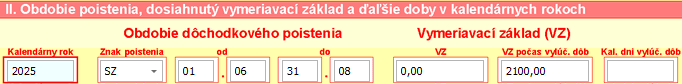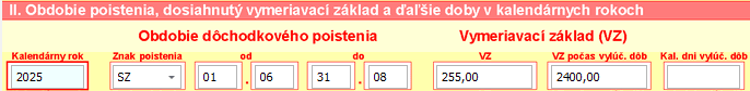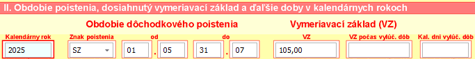 Ak sa obdobia starobného a invalidného poistenia nezhodujú počas celého obdobia trvania dohody, dosiahnuté VZ na SP a IP sa uvedú samostatne v dvoch alebo vo viacerých riadkoch. Ako prvé sa uvedú všetky obdobia starobného poistenia a následne všetky obdobia invalidného poistenia. VZ na SP sa uvedú v rubrike VZ. VZ na IP sa uvedú v rubrike VZ počas vylúč. dôb.