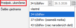 Pri pridávaní materskej dovolenky program automaticky doplní dátum predpokladaného ukončenia v poli Predpok. ukončenie. Vychádza pri tom zo štandardnej dĺžky materskej dovolenky v trvaní 34 týždňov. V prípade potreby je možné dĺžku materskej dovolenky zmeniť.