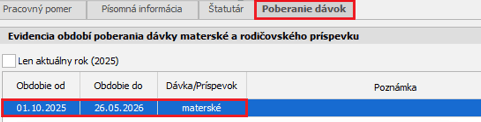 Ak bude žena súčasne poberať dávku materské, v spodnej časti necháte zvolenú voľbu Poberá materské. Program potom automaticky zaeviduje poberanie dávky na záložke Poberanie dávok.