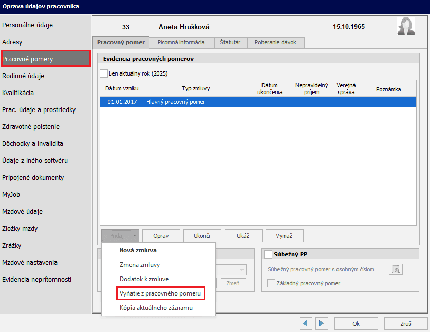 Materská dovolenka sa v programe Mzdy a personalistika OLYMP zadáva v Personalistike na karte Pracovné pomery ako Vyňatie z pracovného pomeru: