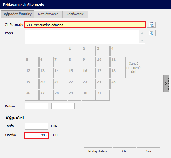 211 – mimoriadna odmena – túto zložku použijete, ak zamestnancom vyplácate odmeny za ich mimoriadne výkony.