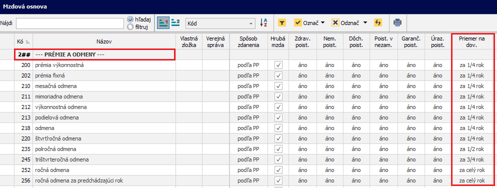Prehľad všetkých zložiek mzdy, ktoré slúžia na zadanie odmien a prémií, nájdete v Mzdovej osnove v časti 2## —PRÉMIE A ODMENY—. V stĺpci Priemer na dov. nájdete informáciu, ako jednotlivé zložky mzdy ovplyvňujú výpočet priemeru na dovolenku.