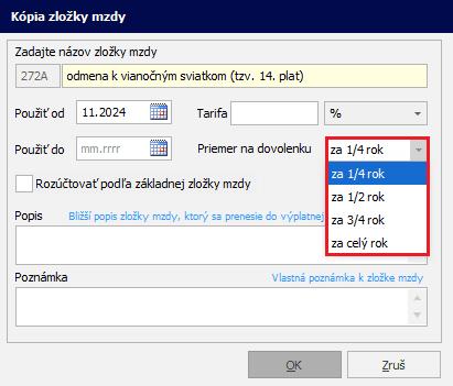 V zostave Profesionál/BIZNIS/PROFI si môžete vytvoriť kópiu jednotlivých zložiek mzdy s vlastným názvom. Pri vytváraní kópie zo zložky mzdy 271 – odmena k letným dovolenkám (tzv. 13. plat) a 272 – odmena k vianočným sviatkom (tzv. 14. plat) cez Mzdové funkcie – Mzdová osnova – Kópia môžete zadať, aký počet štvrťrokov priemeru na dovolenku má táto zložka mzdy ovplyvňovať.