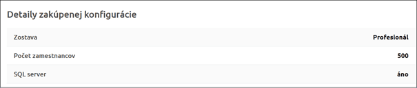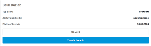 Prostredníctvom voľby „Zmeniť licenciu“ si môžete vybrať zostavu a služby, ktoré Vám vyhovujú (pri Balíku služieb EXTRA si môžete sami nakonfigurovať zostavu a služby).