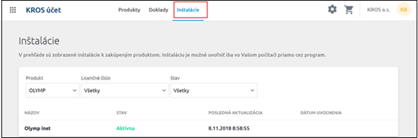 V časti Inštalácie sú zobrazené inštalácie k zakúpeným produktom. Môžete ich filtrovať podľa: