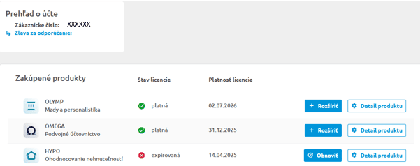 V časti Produkty sa zobrazujú zakúpené produkty spoločnosti.