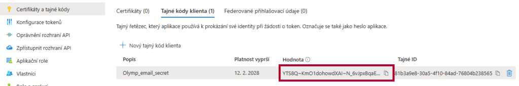 Tajný kód použijeme kód získaný pri pridávaní Certifikáty a tajné kódy (Certificates & secrets).