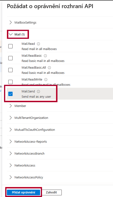 Rozbaliť oprávnenie Mail a zaškrtnúť voľbu Mail.Send a pridať oprávnenie.