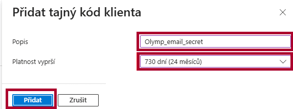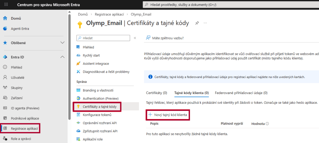 Pridať tajný kód v Certifikáty a tajné kódy (Certificates & secrets)