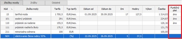 Po vygenerovaní výplaty si môžete na záložke Zložky mzdy skontrolovať v stĺpci Funkčný plat, či príslušná zložka mzdy vstupuje do funkčného platu.