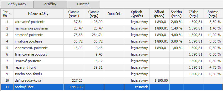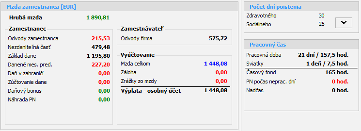Mzda celkom = 1 890,81 eura (HM) – 215,53eura (odvody) – 227,20 eura (daň) = 1 448,08 eura