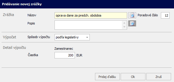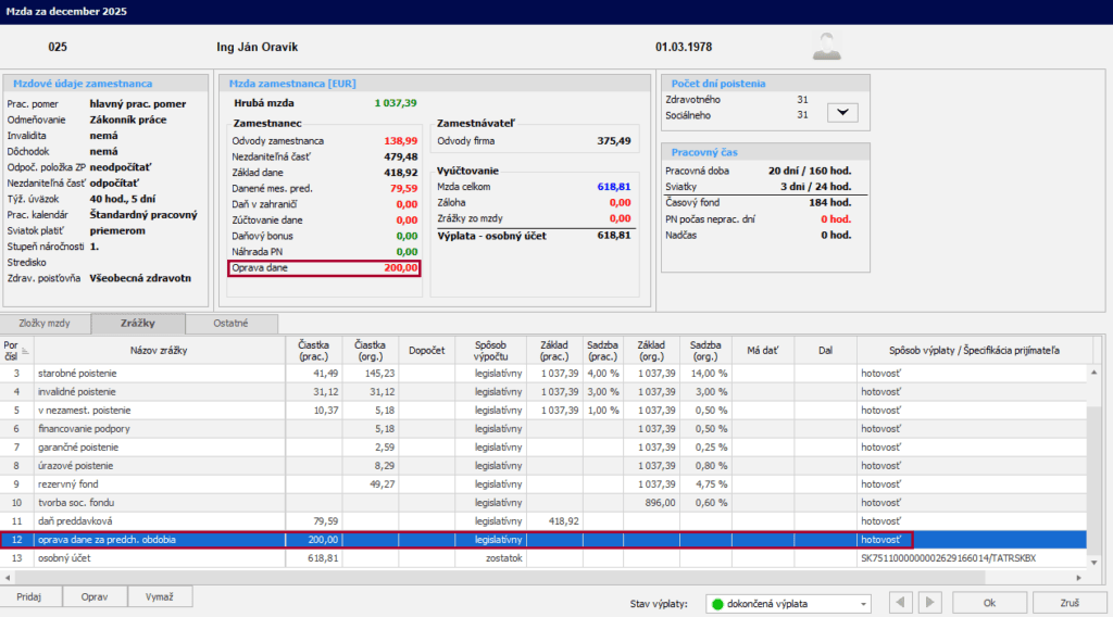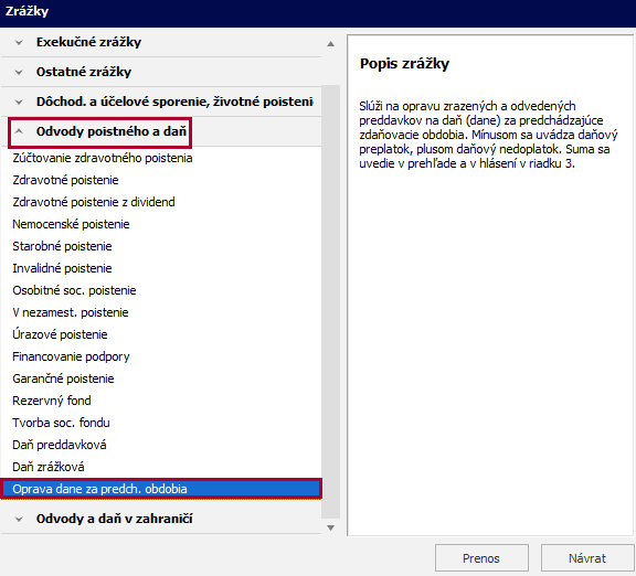 Potrebujete so zamestnancom vysporiadať preplatok alebo nedoplatok na dani za predchádzajúce zdaňovacie obdobia? Pre tento účel slúži zrážka „Oprava dane za predchádzajúce obdobia“.