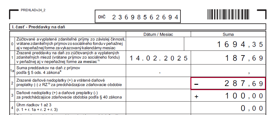V januári 2025 je výška preddavkovej dane 187,69 eura, preplatok z opravy dane za predch. zdaňovacie obdobia 300 eur a preplatok z ročného zúčtovania dane 100 eur. Vo februári 2025 je výška preddavkovej dane 270,12 eura a ďalšiemu zamestnancovi je zrazený nedoplatok za predch. obdobia vo výške 200 eur.