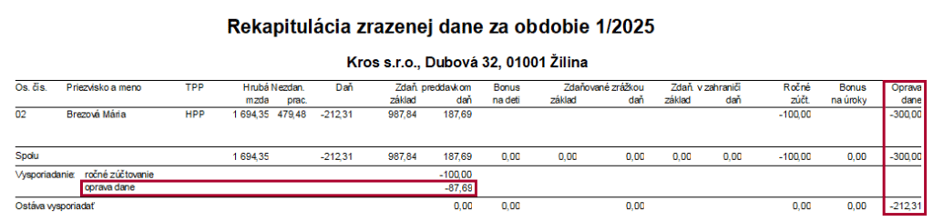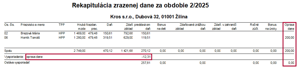 Sumy zo zrážok „Oprava dane za predchádzajúce obdobia“ sa uvedie na Rekapitulácii uhradenej preddavkovej dane v stĺpci Oprava dane. Ak je celková suma opravy dane preplatok, uvedie sa v stĺpci Oprava dane – celková mínusom, ak je celková suma opravy dane nedoplatok, uvedie sa plusom. V stĺpci Oprava dane – požiadať sa zobrazí mínusom zvyšná suma preplatku, ktorú nebolo možné v danom mesiaci vysporiadať. O túto sumu bude program v ďalších mesiacoch automaticky ponižovať úhrn preddavkovej dane, avšak iba v prípade, ak zamestnávateľ nepožiada správcu dane o jej vrátenie. Vygenerovaním prevodného príkazu „Vrátenie dane za predch. obdobia“ sa suma zobrazí v stĺpci Oprava dane – požiadaná.