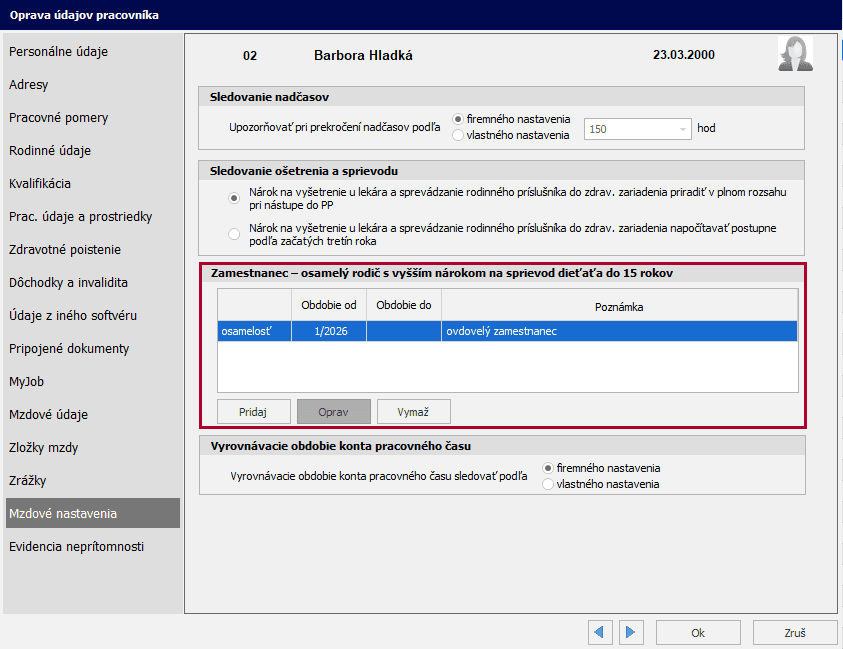 Vyšší nárok na sprievod dieťaťa do 15 rokov je možné zaevidovať v programe Mzdy a personalistika OLYMP od verzie 26.20 v Personalistike zamestnanca na karte Mzdové nastavenia, v časti Zamestnanec – osamelý rodič s vyšším nárokom na sprievod dieťaťa do 15 rokov. Prostredníctvom tlačidla Pridaj je možné evidovať obdobia (v mesiacoch), počas ktorých má zamestnanec nárok na ďalších 7 dní sprievodu dieťaťa do 15 rokov do zdravotníckeho zariadenia na vyšetrenie alebo ošetrenie, prípadne do zariadenia poradenstva a prevencie na výkon odborných činností. Ku každému záznamu je možné pridať aj Poznámku, do ktorej si môžete uviesť, či ide napr. o slobodného, ovdoveného alebo rozvedeného zamestnanca.