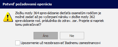 Ak si zamestnanec ešte nevyčerpal 7 dní pracovného voľna na sprievod rodinného príslušníka pod zložkou mzdy 362 sprevádzanie rod. príslušníka do zdrav. zar., program pri uložení výplaty zobrazí upozornenie. V tomto upozornení je možné označiť, aby sa hláška už nezobrazovala žiadnemu zamestnancovi.