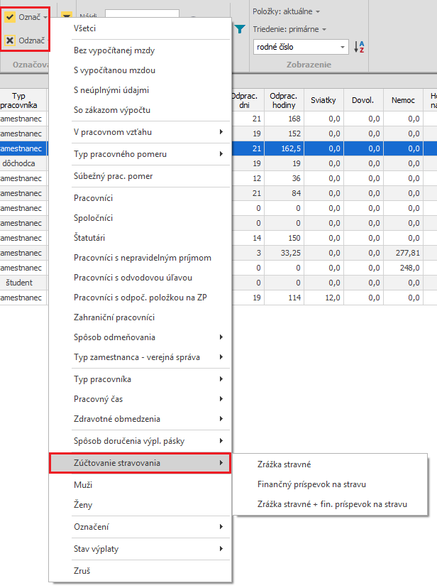 Vo verzii 21.70 pribudla možnosť označiť resp. odznačiť zamestnancov podľa spôsobu zabezpečenia stravovania. Táto možnosť je doplnená v Personalistike aj vo Výpočte mzdy. V hlavnom menu v časti Označovanie zvolíte Zúčtovanie stravovania a vyberiete buď zrážka stravné, finančný príspevok na stravu alebo kombináciu týchto dvoch spôsobov (zrážka stravné + finančný príspevok na stravu).