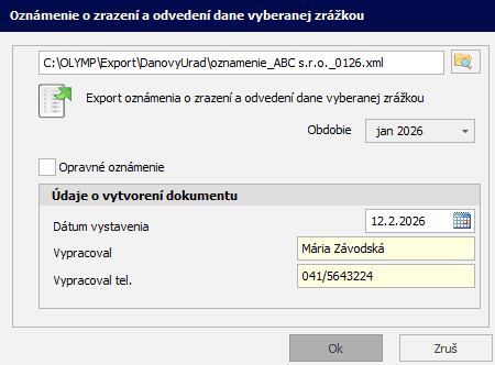 Oznámenie o zrazení a odvedení dane vyberanej zrážkou obsahuje súhrnné údaje o zrazenej a odvedenej dani vyberanej zrážkou. Do riadku 01 (Daň zrazená) sa doplní zrážková daň súhrnne za všetkých zamestnancov zrazená vo výplatách v danom mesiaci. Do stĺpca Daň odvedená sa uvádza suma zrážkovej dane z vygenerovaného prevodného príkazu. Do riadku 01a sa vyplní zrazená zrážková daň zo zložiek mzdy 263, 264, 266, 267 vo výplatách. V stĺpci Daň odvedená sa uvádza odvedená zrážková daň za tieto dividendy z prevodného príkazu. Riadky 02 a 03 program nevypĺňa.