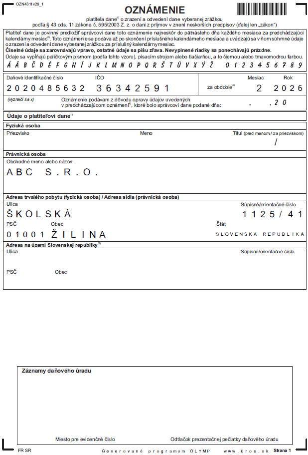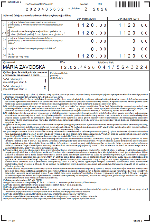 Plánujete vyplácať podiel na zisku fyzickej osobe – daňovému rezidentovi SR? Zrážkovú daň je potrebné zraziť už pri výplate dividendy. Sadzba zrážkovej dane závisí od toho, v ktorom zdaňovacom období bol dosiahnutý zisk, ktorý firma rozdeľuje. FR SR určuje pre rok 2026 vzor tlačiva Oznámenia platiteľa dane o zrazení a odvedení dane vyberanej zrážkou podľa § 43 ods. 11 zákona č. 595/2003 Z. z. o dani z príjmov s označením OZN4311v26.