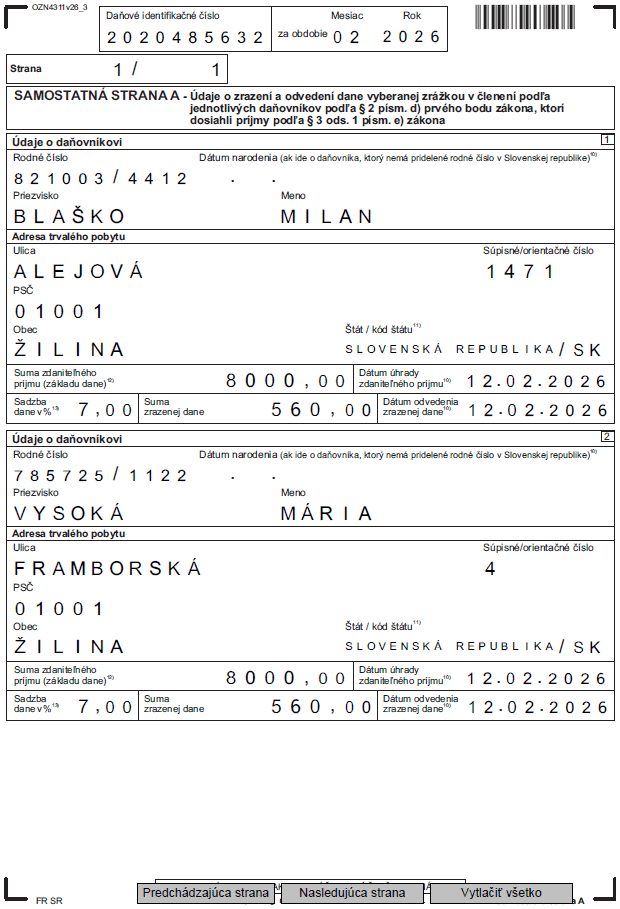 Od roku 2026 je možné vytlačiť a vyexportovať z programu aj Samostatnú stranu A, ktorá je prílohou. Obsahuje údaje o jednotlivých zamestnancoch, ktorým bol vyplatený príjem zdaňovaný zrážkovou daňou.