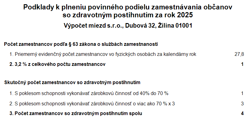 Ako pomôcka pri vytváraní elektronického ročného výkazu o plnení povinného podielu zamestnávania občanov so ZPS slúžia Podklady k plneniu povinného podielu zamestnávania občanov so zdravotným postihnutím. Dokument nájdete v menu Tlač – Tlač – Štatistika – Zamestnávanie občanov zo ZPS.
