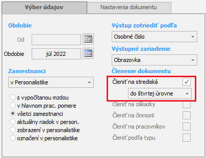 Dokument je možné členiť na strediská označením príslušnej voľby na formulári pred tlačou.