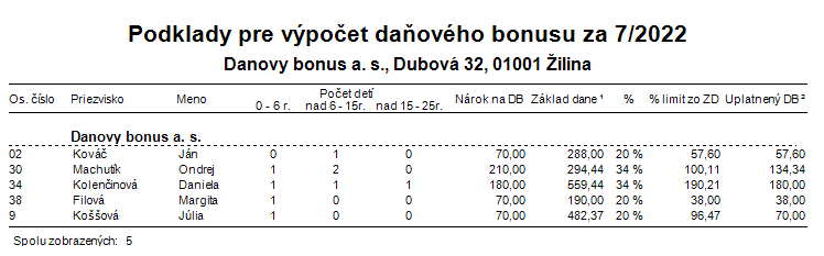 Obsahuje údaje pre výpočet daňového bonusu a uplatnený daňový bonus za zvolený mesiac, pričom sa na dokumente zobrazia len tí zamestnanci, ktorí v danom mesiaci mali aspoň 1 dieťa, na ktoré si uplatňujú daňový bonus. Údaje na dokumente sa zobrazujú v súčte za všetky súbežné pracovné pomery zamestnanca.