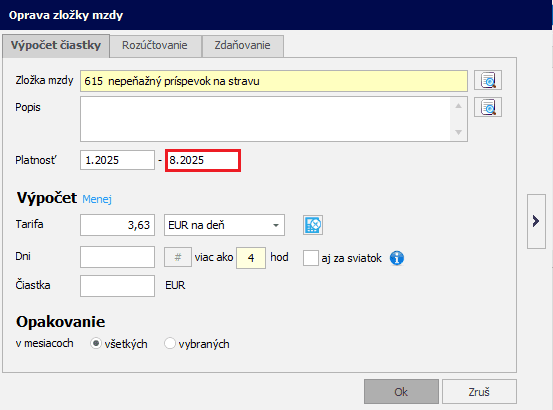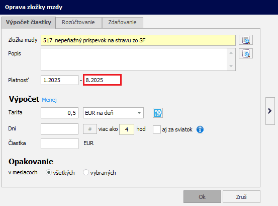 Rovnakým spôsobom ukončíte k augustu 2025 aj zložku mzdy 517 – nepeňažný príspevok na stravu zo SF. Touto zložkou mzdy evidujete príspevok na stravné lístky zo sociálneho fondu vo výške 0,50 eura na deň.