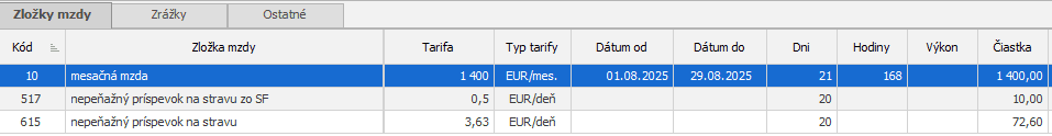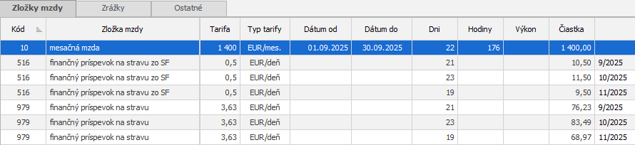 Zamestnanec bude mať v mzde za 09/2025 zúčtovaný 3x finančný príspevok na stravu a 3x finančný príspevok na stravu zo SF. Do poľa Popis na zložke mzdy môžete doplniť mesiac, na ktorý sa príspevok vypláca. Popis sa zobrazuje na Výplatnej páske – Výpis zložiek, Výplatnej páske – Tajný formát a Výplatnej páske – Farebný formát.