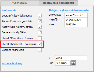 Ak do zložky mzdy neuvediete obdobie, pred tlačou týchto typov výplatných pások označte v tlačovom formulári na záložke Nastavenia dokumentu voľbu Uviesť obdobie k FP na stravu. Program obdobie prenesie podľa nastavení zložky mzdy.
