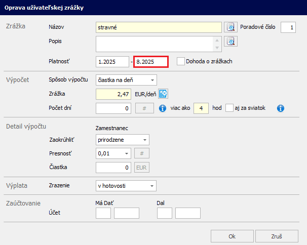 Na karte Zrážky ukončíte platnosť zrážky stravné mesiacom 08/2025, pretože za tento mesiac má zamestnanec poslednýkrát poskytnutý stravný lístok. Od septembra 2025 už zamestnancovi poskytujete finančný príspevok na stravovanie.